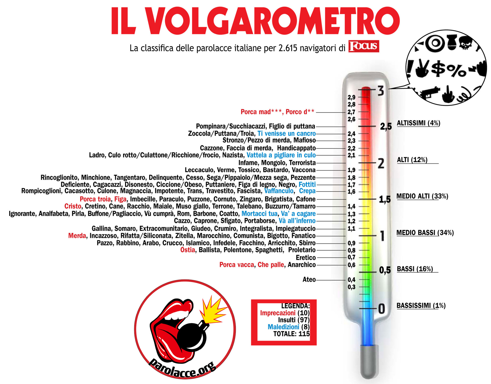 Ecco qui sotto il volgarometro (cliccare sull’immagine per ingrandirla), ovvero la classifica delle parolacce a seconda del loro grado di offensività e volgarità percepiti.