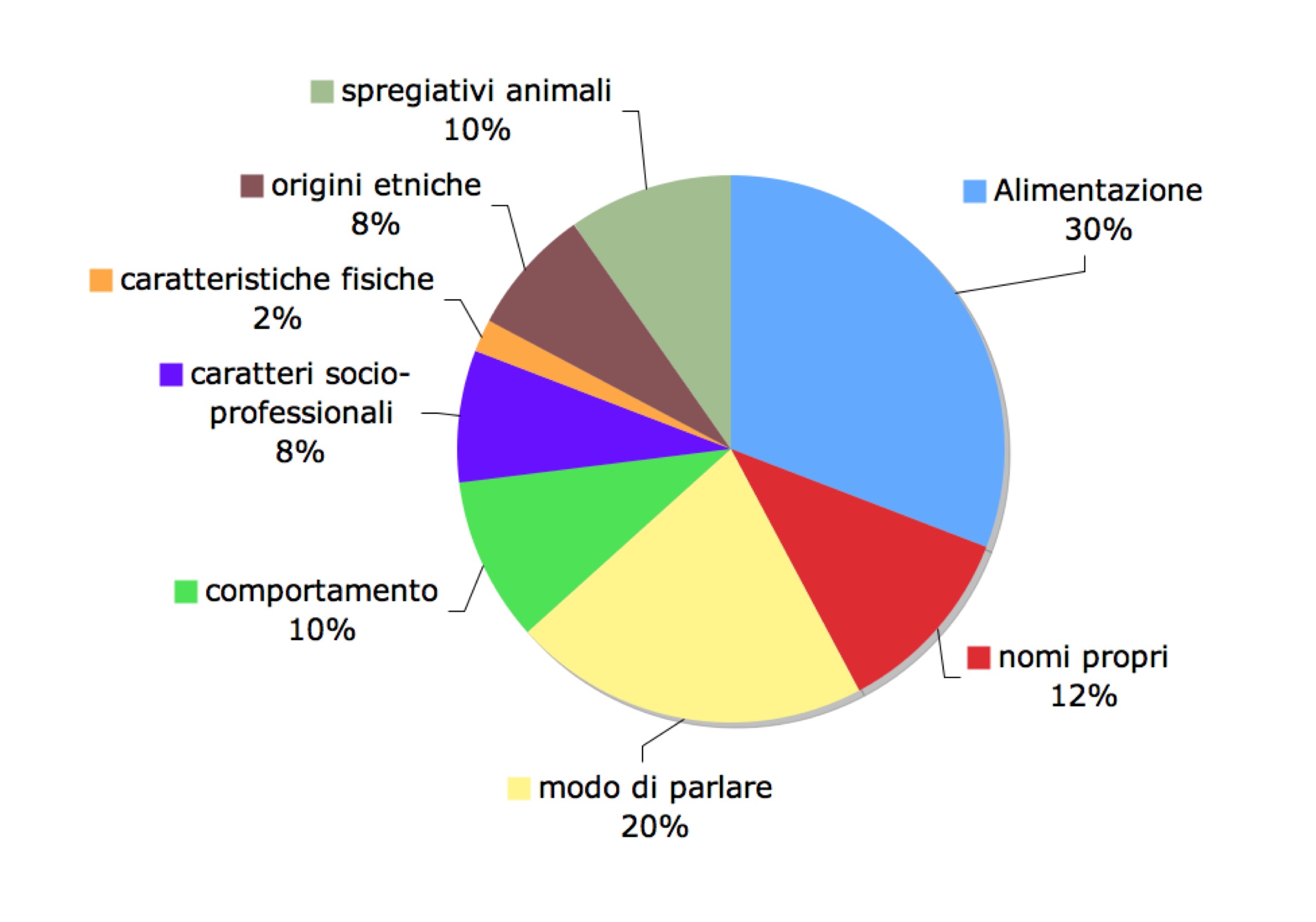 Per studiarli meglio, li ho classificati per tipologia: li ho radunati per significato, a seconda del bersaglio del disprezzo, dalle abitudini alimentari al modo di parlare. Eccoli: