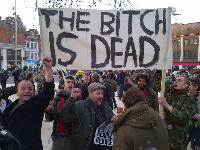 Ecco perché, anche a distanza di 23 anni dalle sue dimissioni, la sua scomparsa ha ispirato non solo lacrime (di coccodrillo o sincere) ma persino feste di piazza, con centinaia di partecipanti che brandivano cartelli con lo slogan “The witch is dead” (la strega è morta) o addirittura “The bitch is dead” (“La puttana è morta”). Una scelta dirompente, soprattutto perché parlar male di un morto, in generale, è tabù: tant’è che molti giornali hanno censurato la notizia.
