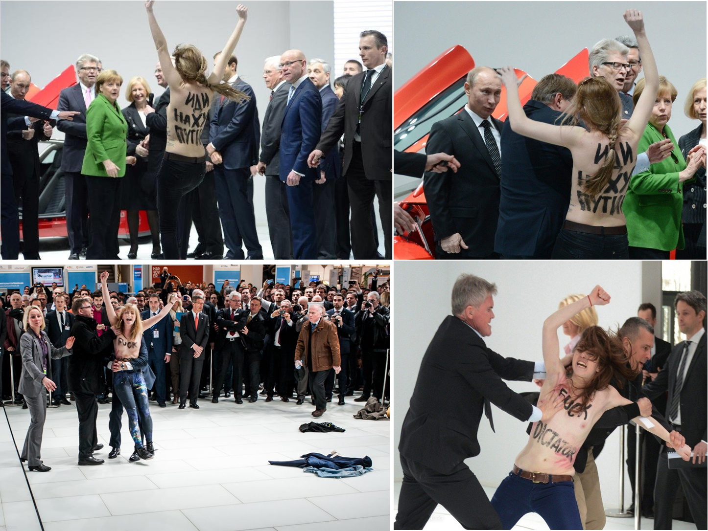 | IL FATTO. 8 aprile, Hannover (Germania). Il presidente russo Vladimir Putin visita la Fiera di Hannover, la più grande fiera industriale al mondo, accompagnato dalla cancelliera Angela Merkel. A un certo punto, nei pressi dello stand della Volkswagen irrompono 4 attiviste di Femen a torso nudo, esibendo sul seno e sulla schiena la scritta (in inglese e in russo) “Fuck dictator” , disegnata con smalto nero. Le donne, che urlavano “Fucking dictator” (fottuto dittatore) e “Go to hell dictator” (vai all’inferno, dittatore) sono state subito bloccate e portate via dagli uomini della sicurezza. | PERCHÉ È NELLA TOP TEN. Probabilmente Putin non è mai stato contestato in modo così plateale, duro e deciso per “l’omofobia, la teocrazia della Chiesa ortodossa e la dittatura”, come urlavano le attiviste. Le Femen protestano col corpo nudo, vulnerabili nella loro cruda femminilità esposta agli sguardi e agli obiettivi, e non sono intimorite da alcuna autorità. La loro forza sta nella loro debolezza: diventano invincibili perché qualunque tentativo di fermarle diventa una violenza. Le foto dell’iniziativa, durata una ventina di secondi, sono finite sui giornali di tutto il mondo. Dopo il loro fermo, la Merkel ha chiesto a Putin di non denunciarle, in nome della libertà d’espressione. Un’iniziativa del genere in Russia avrebbe avuto probabilmente tutt’altro esito… |