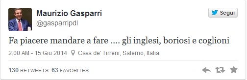Mondiali di Calcio: l’Italia batte il Regno Unito per 2 a 1. Maurizio Gasparri, vicepresidente del Senato (Pdl), twitta: “Fa piacere mandare a fare… gli inglesi, boriosi e coglioni”.Un attacco a gamba tesa: Gasparri, del resto, è noto per uno stile tutt’altro che sobrio su Twitter, dove non esita a insultare altri politici, personaggi dello spettacolo e comuni cittadini. Stavolta il suo Tweet, oltre a scatenare valanghe di commenti negativi in Rete, varca la Manica diventando un caso internazionale: ne ha parlato con dovizia di particolari perfino il quotidiano britannicoGuardian, che ha definito Gasparri «uno dei politici italiani più abituali alle gaffe».Ma Gasparri non se n’è dato per inteso: «è una tempesta in un bicchier d’acqua», ha commentato. «Mi diverte questa polemica un po’ ridicola che hanno montato su una cosa avvenuta nell’euforia per la vittoria. Il fatto è che l’Italia batte abitualmente l’Inghilterra nelle partite importanti. Noi siamo 4 volte Campioni del Mondo mentre loro hanno vinto la Coppa solo una volta nel ’66». Insomma, nessun pentimento: si attende il prossimo incidente internazionale.