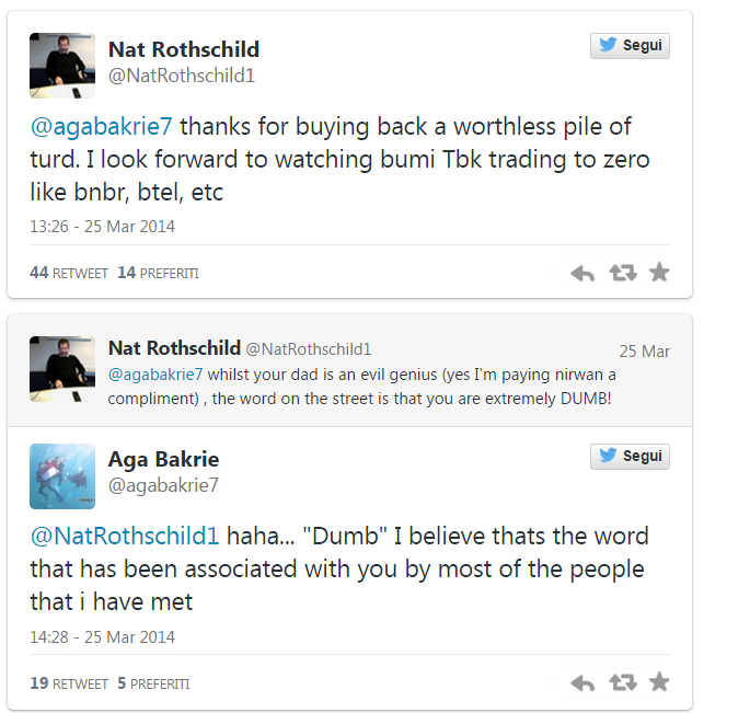 Dopo 3 anni, divorziano due uomini d’affari: l’indonesiano Aga Bakrie (socio del presidente dell’Inter Erick Thohir) e Nat Rothschild (erede della storica dinastia bancaria britannica). Si erano uniti nella società Bumi per il business del carbone in Asia, ma gli affari erano andati male. Così Barkrie, per 500 milioni di dollari, ha comprato le quote della Bumi di Rotschild. A transazione finita, Rotschild ha subito twittato: «Grazie d’aver ricomprato un inutile mucchio di merda. Non vedo l’ora di vedere la Bumi a quota zero». Bakrie ha replicato con più aplomb, scrivendo: «Abbiamo riportato in Indonesia le nostre miniere strappandole agli imperialisti». Ma Rotschild ha ribattuto: «mentre tuo padre è un genio, corre voce che tu sia un grosso stupido!». E Bakrie: «Ah ah… “Stupido” credo sia la parola che viene associata a te dalla maggior parte delle persone che ho incontrato».Raramente si può assistere a uno scontro così crudo nel mondo degli affari: in questo caso l’economia ha svelato davanti a tutti il suo volto più spietato, fatto di sopraffazioni fatte e subìte, sberleffi, offese.