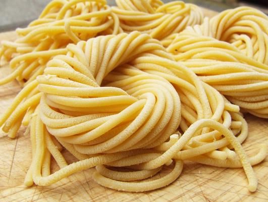 BIGOLI: da baco, vermicello. I bigoli sono una pasta fresca lunga e sottile, a base di farina integrale. Il termine, nel Nord Italia, designa anche il membro virile (ed è usato come sinonimo di “persona sciocca”). Simili ai bigoli sono anche i “pici” toscani, ma non derivano da “picio” (piccolo, membro virile), bensì dal fatto che la farina è appiccicosa essendo composta da farina, uova e acqua.