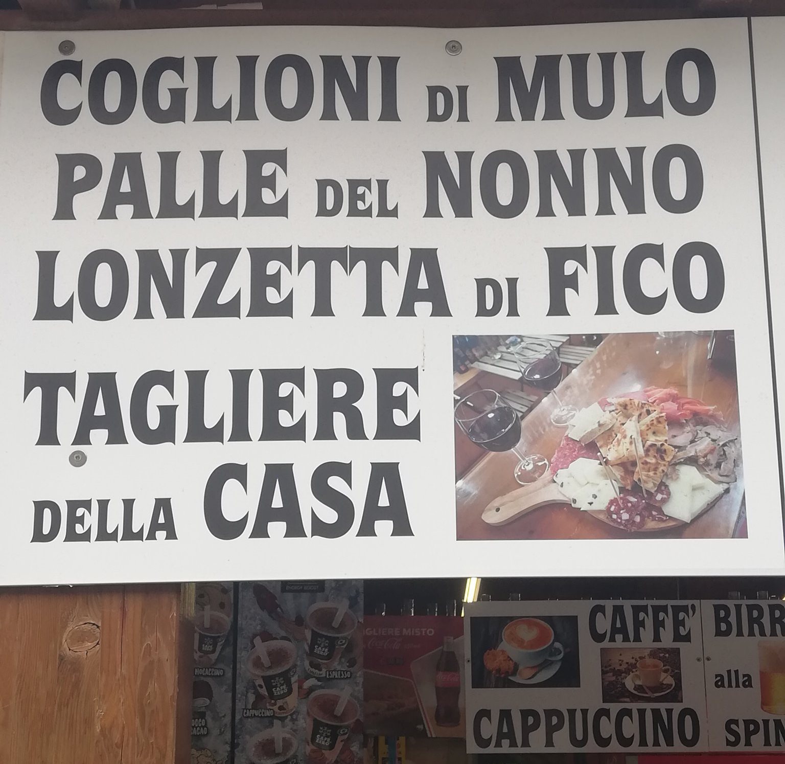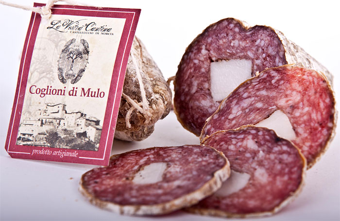 COGLIONI DI MULO: questo insaccato (un salame di maiale con un cilindro compatto di lardo) è originario della zona di Campotosto (Abruzzo), e il nome ha un’origine simile alla precedente: la forma ricorda i grossi testicoli di un mulo. E’ noto anche come “mortadella di Campotosto” e ha oltre 500 anni di storia.