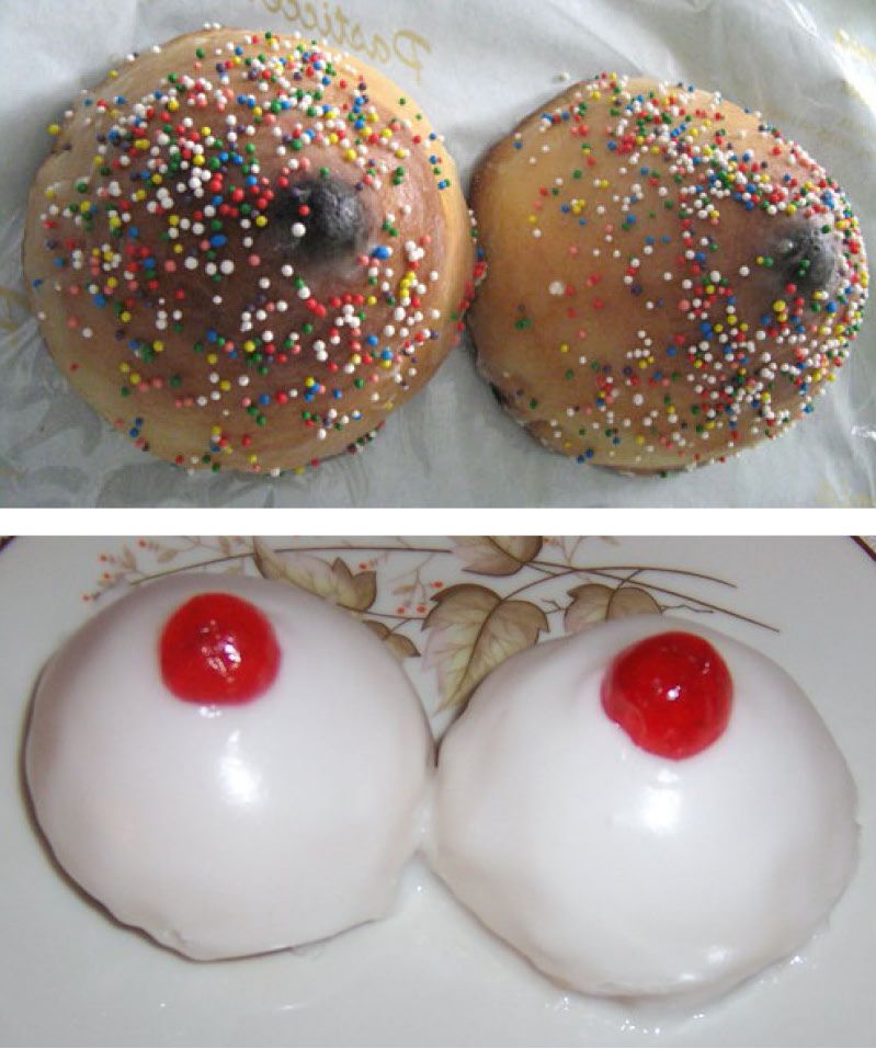 Due versioni di “tette di vergine””: sopra con pasta frolla, sotto con marzapane.