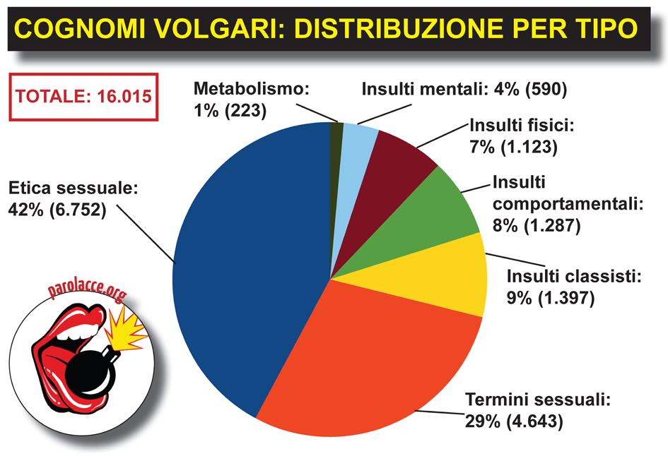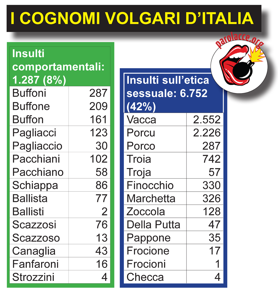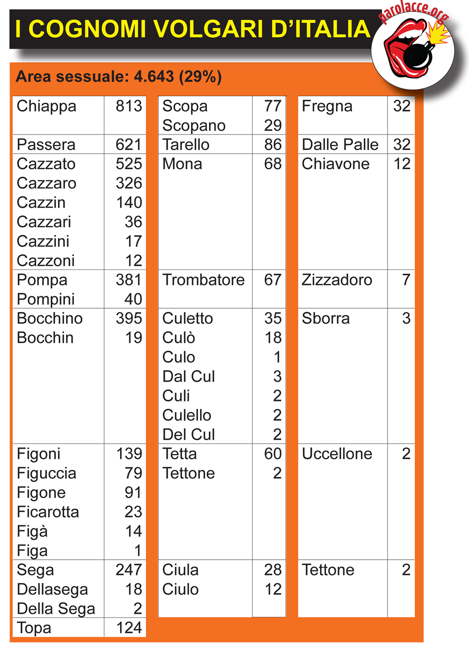 Ma vediamo più da vicino quali sono questi cognomi e come sono distribuiti, a seconda del loro significato: la maggior parte (il 71%) fanno riferimento al sesso, ovvero descrivono parti anatomiche o atti sessuali (Cazzoni, Scopano), oppure stigmatizzano comportamenti sessuali (Finocchio, Zoccola). Il resto sono sostanzialmente insulti.