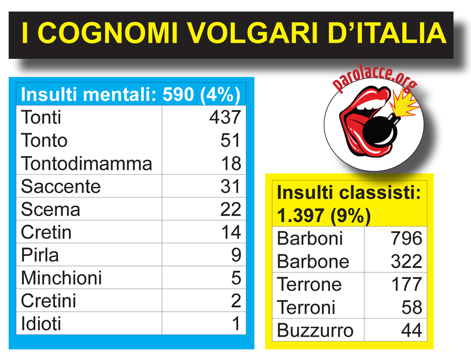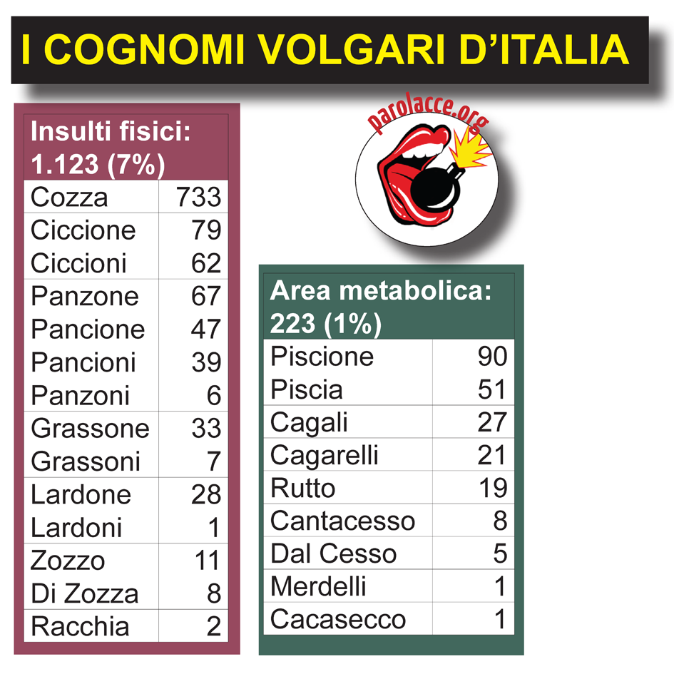 Come faccio a dire questo? In Italia non esiste un’anagrafe centralizzata, e anche se esistesse non sarebbe accessibile. Dunque, per studiare i cognomi esiste un solo modo, scoperto dal linguista Emidio De Felice alla fine degli anni ’70: esaminare gli elenchi telefonici. Oggi il compito è più facile, visto che sono sul Web: così, con pazienza, aggiornando le ricerche che avevo fatto 20 anni fa per il mio primo libro (già: proprio sui cognomi) ho digitato tutte le parolacce della nostra lingua sul sito di Pagine Bianche. In questo modo ho potuto accertare quante persone avevano un cognome volgare (tralasciando i nomi delle attività commerciali, spesso inventati).
