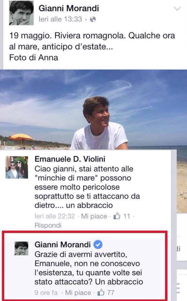 Facciamo un esempio concreto. Lo scorso maggio, Morandi aveva pubblicato una propria foto su una spiaggia romagnola. Un lettore gli ha scritto questo commento offensivo: “Ciao Gianni, stai attento alle minchie di mare, possono essere molto pericolose soprattutto se ti attaccano da dietro”. Ed ecco la risposta di Morandi: “Grazie di avermi avvertito, non ne conoscevo l’esistenza. Tu quante volte sei stato attaccato? Un abbraccio”. Pungente, ma con eleganza.