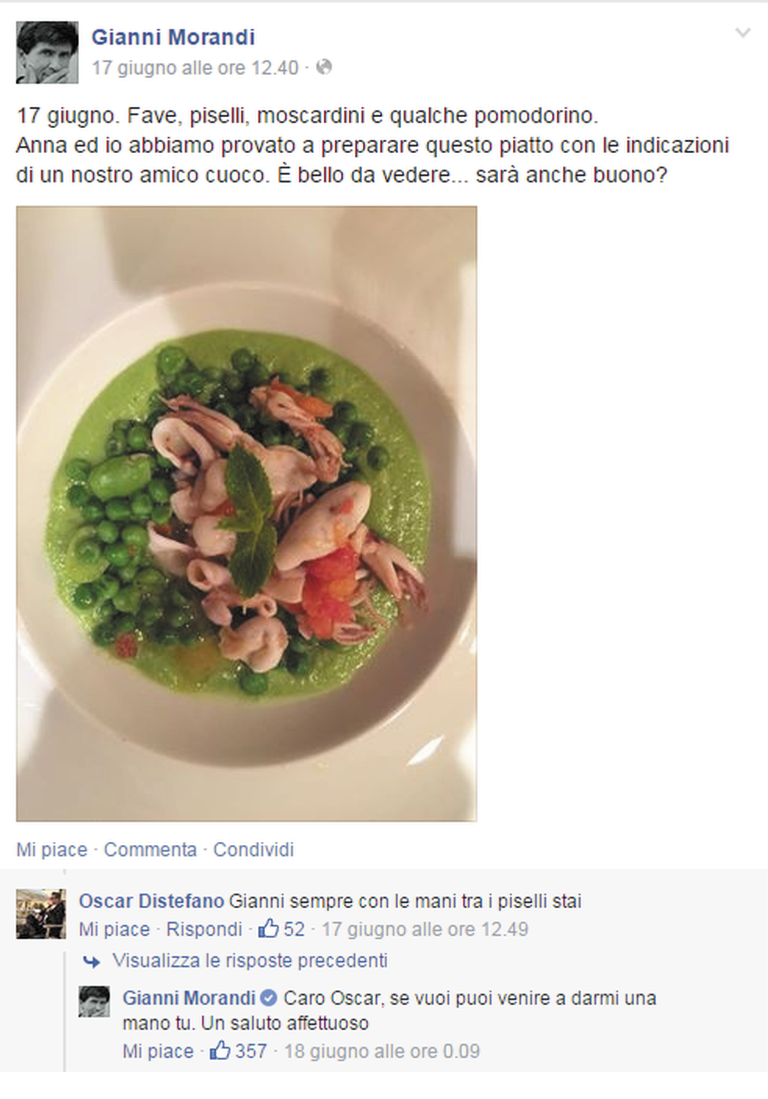 Per esempio dopo aver postato la foto di un piatto di fave, piselli, moscardini e pomodoro, un lettore gli ha scritto provocatoriamente: “Gianni, sempre con le mani tra i piselli stai”. Morandi gli ha risposto: “Caro Oscar, se vuoi puoi venire a darmi una mano tu. Un saluto affettuoso”.