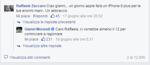 Non era un episodio isolato. Morandi – seguito su Facebook da oltre 1,7 milioni di fan – ha un modo inusuale di reagire agli insulti, tanto da avere ispirato schiere di seguaci, come il sito umoristico “Rispondere agli insulti come farebbe Gianni Morandi“. Un esempio (positivo) da imitare, insomma.