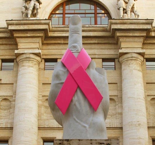 Tumore al seno? Dito medio (2015). L’ultima campagna trash risale allo scorso autunno: la sezione milanese della Lilt (Lega italiana per la lotta contro i tumori) ha posto il fiocco rosa – simbolo internazionale della lotta contro il tumore al seno) – sul L.O.V.E., la celebre scultura del dito medio davanti alla sede della Borsa di Milano. Invece di una parolaccia, un gestaccio: ma il messaggio resta lo stesso: “Un gesto forte e irriverente per dire no al tumore al seno”, dice la Lilt, “un messaggio provocatorio per ribadire che non bisogna mai abbassare la guardia“. Sarà, ma la campagna risulta poco efficace, perché il segno (la scultura di Cattelan, famosa e ciclopica) prevale sul significato. E nessuno indosserebbe un nastro sul dito medio invece che al polso: in questo modo, ha obiettato ironicamente qualcuno, sembra più una campagna contro il tumore alla prostata.