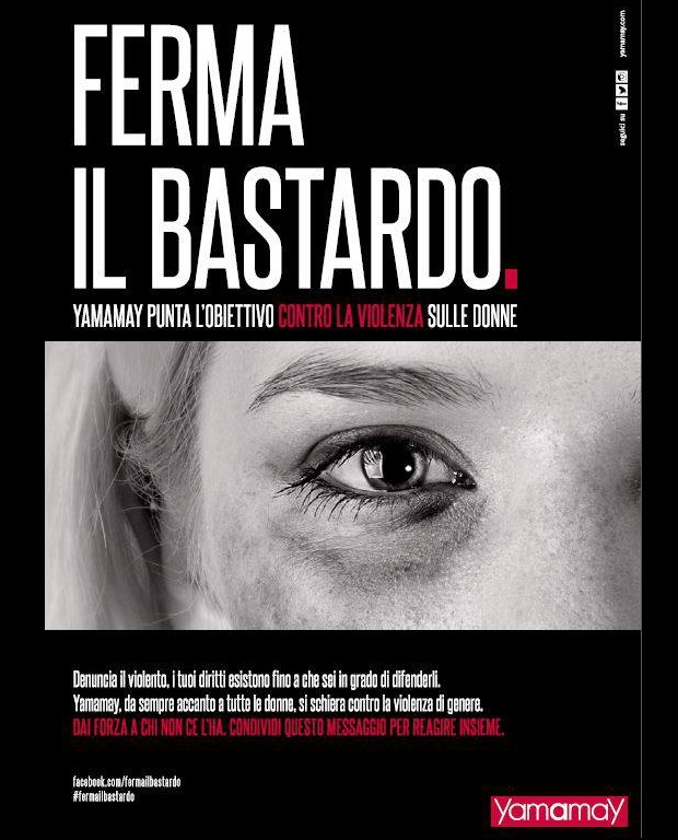 “Ferma il bastardo” (2013). La campagna è stata promossa da Yamamay, noto marchio di abbigliamento femminile. Ancora una volta, la foto di una donna maltrattata (il primo piano di un occhio pesto) e lo slogan: “Ferma il bastardo“. Anche in questo caso, osserva Cosenza, un messaggio generico (in che modo si possono fermare i violenti?) e una violenza esibita: di certo, non si aiutano le donne a uscire dal ruolo di vittime se le si mostra sempre come vittime, commenta ancora Cosenza. Sarebbe più interessante (anche se più difficile) concentrare l’attenzione sull’uomo.