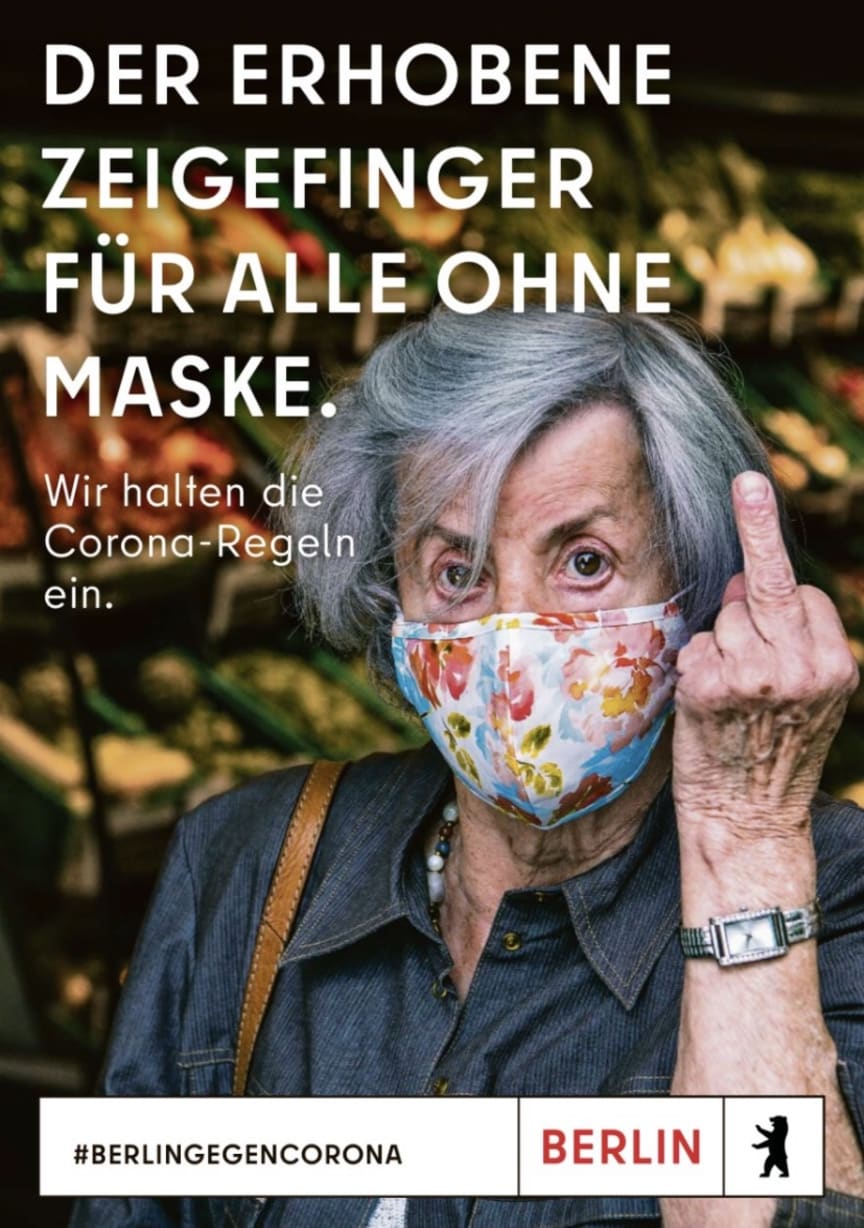 “L’indice alzato per tutti quelli senza maschera” (2020). Questa campagna provocatoria è stata promossa dal Dipartimento per l’economia di Berlino e dall’ufficio turistico “Visit Berlin”. E’ una campagna provocatoria per sensibilizzare i tedeschi a indossare la mascherina per prevenire il contagio da Coronavirus o Covid che dir si voglia. La campagna è attuata con un contrasto e un doppio senso: lo slogan fa riferimento all’indice (“indice alzato” significa “stai attento”), ma l’immagine mette in evidenza il dito medio.