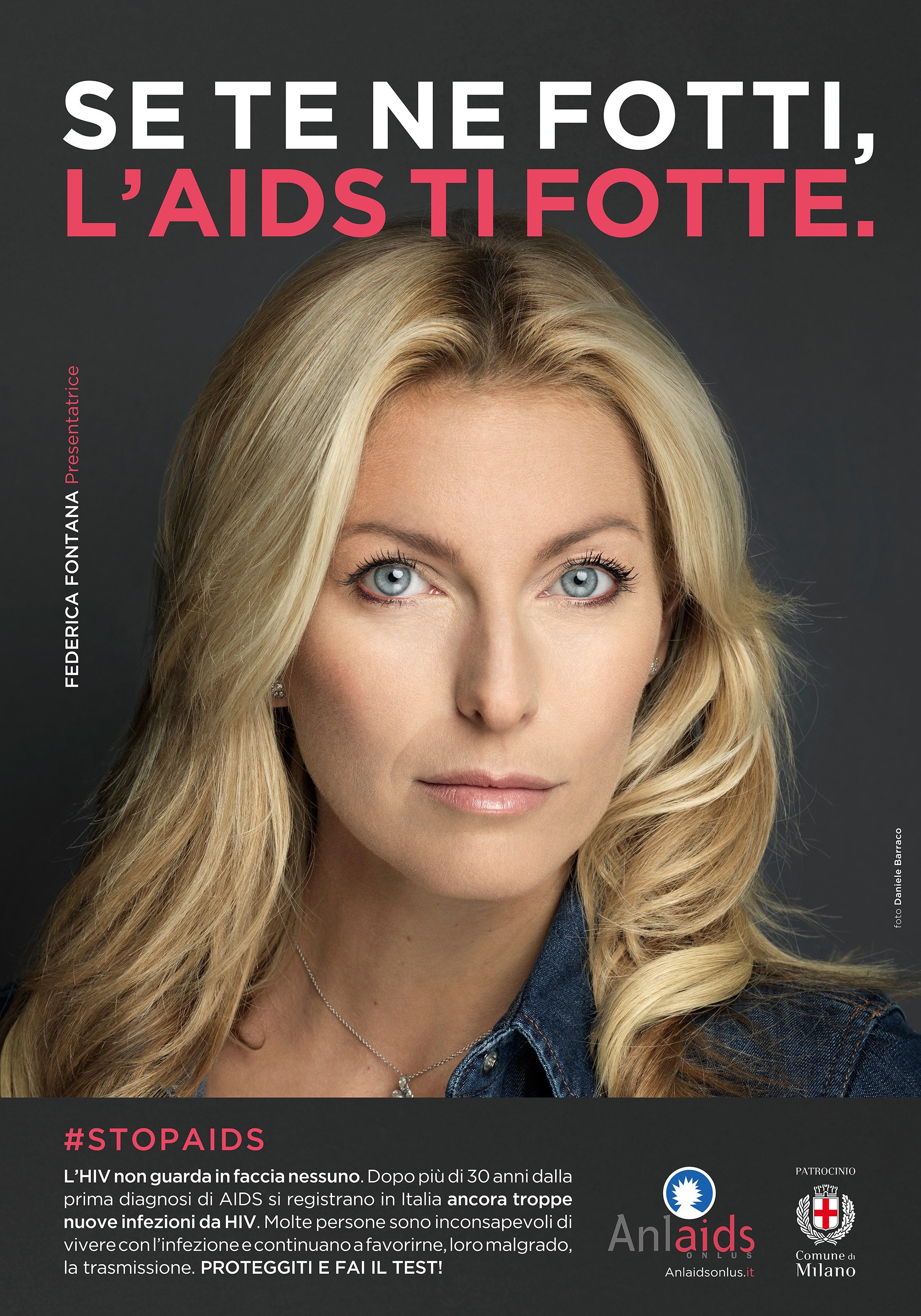 “Se te ne fotti, l’Aids ti fotte” (2017). Vuole scuotere le coscienze, la campagna che l’associazione Anlaids (Associazione nazionale lotta all’Aids) ha scelto per far tornare sotto i riflettori l’allarme Hiv in occasione della Giornata mondiale contro l’Aids. Ancora oggi, in Italia, ci sono 4mila nuove diagnosi di infezione all’anno, Così l’Anlaids ha reclutato diversi personaggi del mondo dello spettacolo, dello sport e del volontariato (da Federica Fontana a Saturnino), che hanno posato sotto lo slogan dirompente. Il gioco di parole, basato sul doppio senso fottersene-essere fottuto, è molto efficace, soprattutto perché è rivolto ai giovani. Tanto più che si parla di un’infezione trasmessa principalmente per via sessuale.