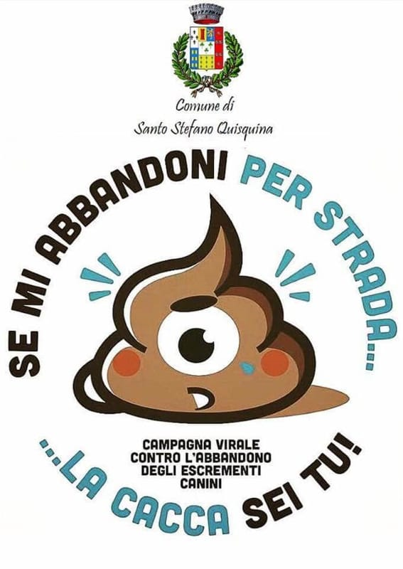 “Se mi abbandoni per strada… la cacca sei tu” (2019). La giunta di Santo Stefano Quisquina (Agrigento) in Sicilia, ha deciso che per combattere il problema degli escrementi canini bisogna passare alle maniere forti. E così ha lanciato il manifesto qui a lato sui canali social ufficiali del Comune, sperando che l’immagine e lo slogan diventino virali. Sperano, insomma, che la disapprovazione sociale riesca a cambiare la mentalità dei padroni incivili dei quadrupedi. Un’offesa educativa.