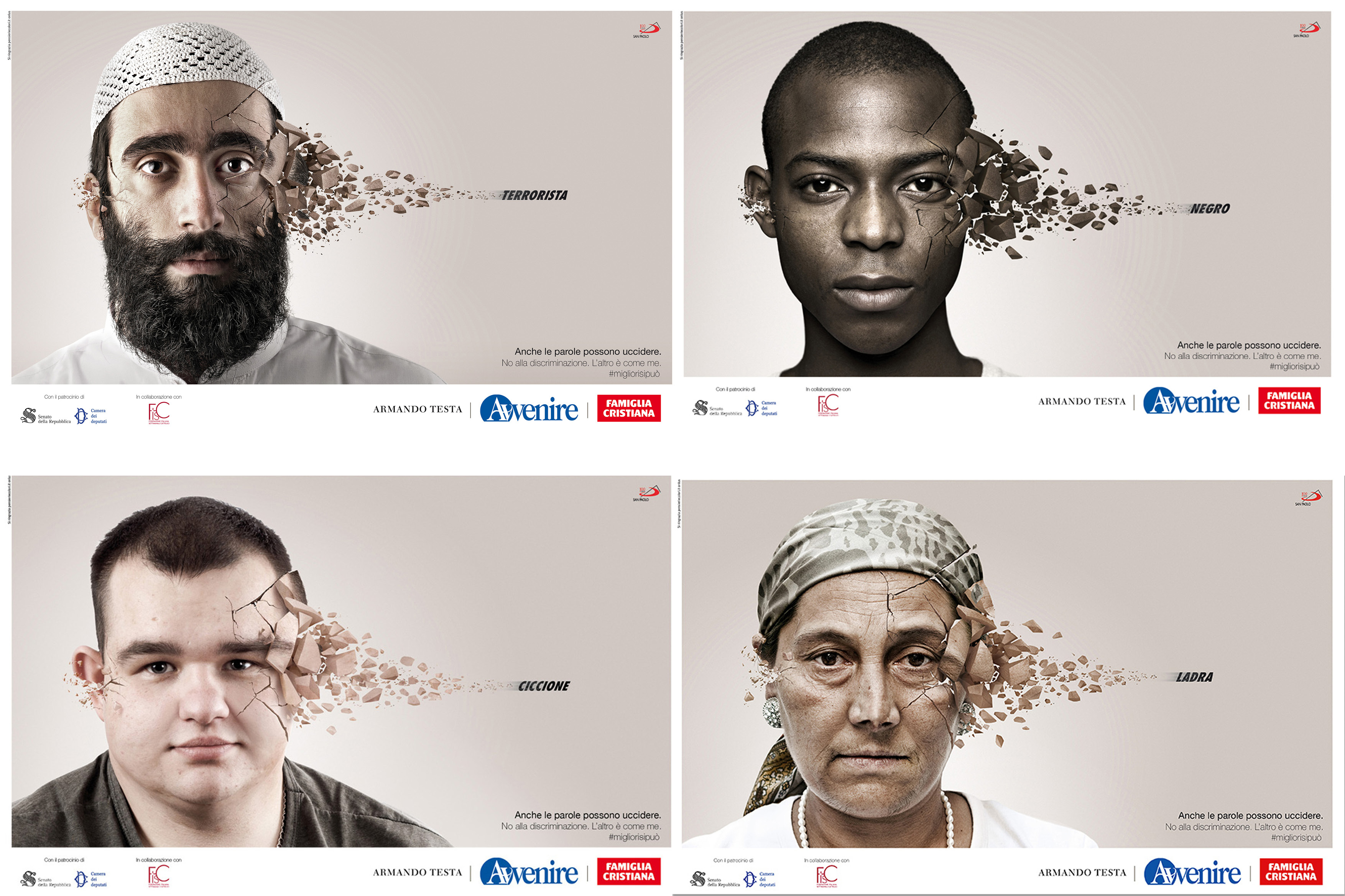 “Negro, ladra, ciccione, terrorista… Anche le parole possono uccidere. No alla discriminazione: l’altro è come me” (2014). La campagna, realizzata da Armando Testa, è stata promossa da Famiglia Cristiana, Avvenire e Fisc (Federazione italiana settimanali cattolici), col patrocinio di Camera e Senato. Lo scopo: “promuovere una cultura della consapevolezza, stimolare la riflessione e la discussione e fornire uno strumento alla crescita personale e sociale”. Le foto, molto curate, colpiscono subito. Perché esprimono efficacemente che gli insulti sono come proiettili: distruggono le persone. Un concetto drammatico, espresso in un modo che non può passare inosservato né lasciare indifferenti.