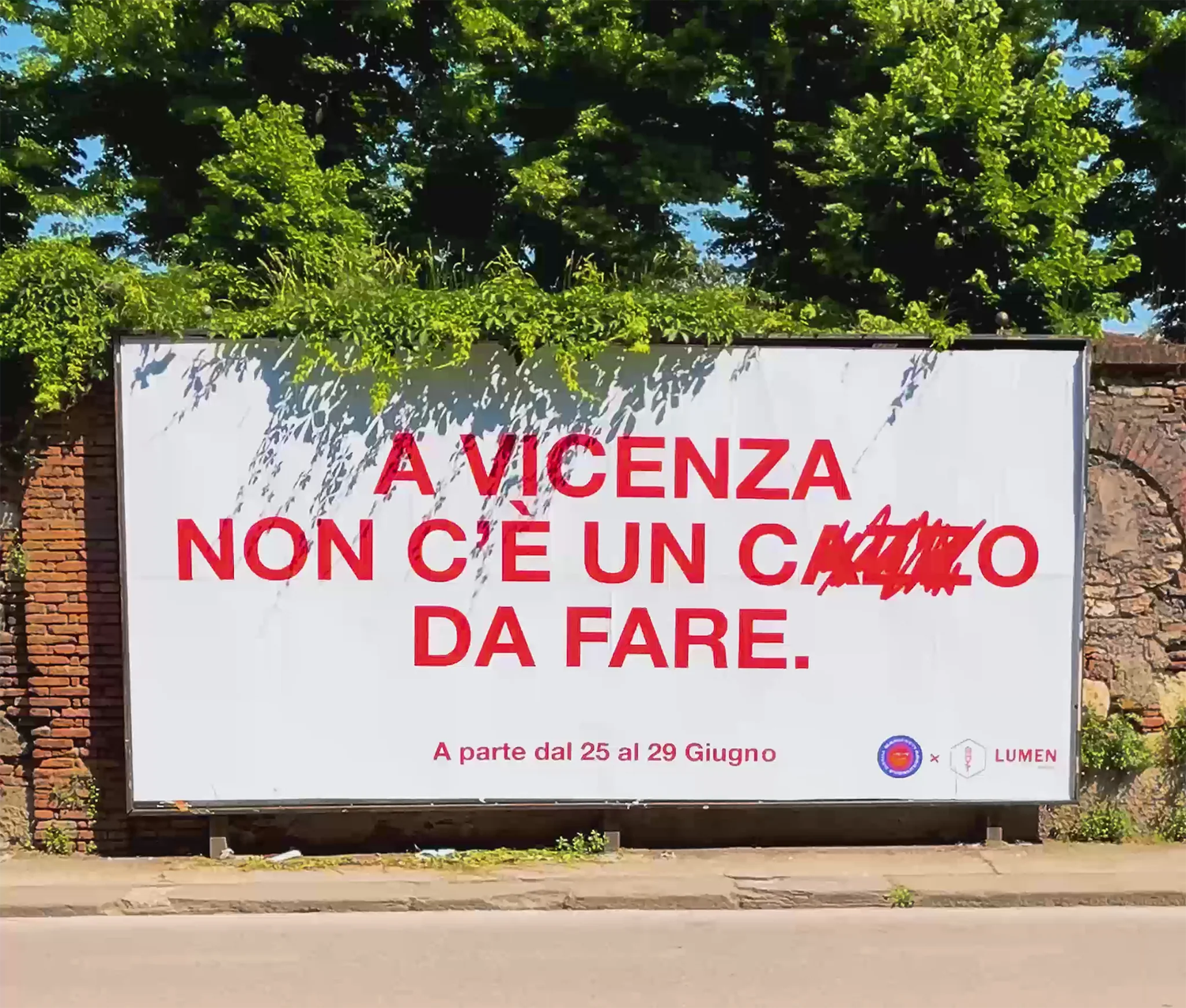 “A Vicenza non c’è un cazzo da fare” (2025): è lo slogan – in parte cancellato, ma comprensibilissimo – del Lumen festival, una manifestazione di musica e cultura prevista a Vicenza dal 25 al 29 giugno prossimi. La campagna è stata ideata da “Manifesti abbastanza ostili”, un progetto di comunicazione che vende poster, magliette, felpe e adesivi ironicamente scurrili (“A nessuno frega un cazzo” e così via). Ecco come l’agenzia presenta la campagna, dedicata a «una delle tante realtà che prova a rendere questa città un po’ più viva, almeno per cinque giorni l’anno. Un po’ provocatoria, un po’ ironica, un po’ polemica, un po’ critica, un po’ vera, un po’ scomoda. Da leggere come vi pare. Una campagna pensata per promuovere un festival e smuovere una città, nell’ordine che preferite».