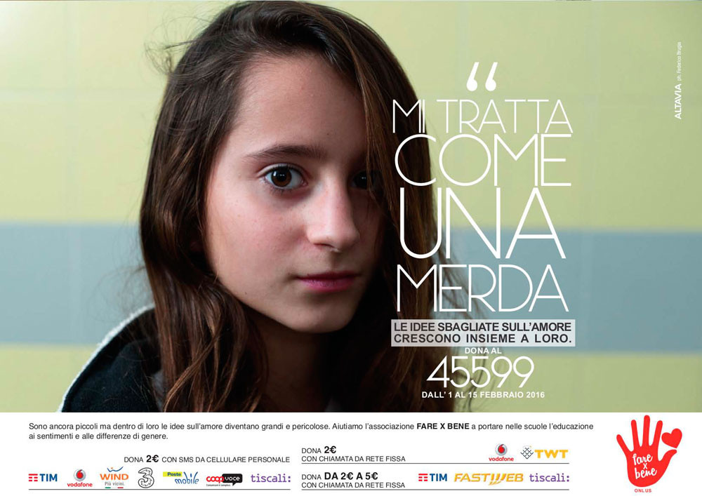 “Mi tratta come una merda” (2016). Per condannare bullismo e discriminazioni di genere, l’onlus “Fare x bene” ha lanciato da poco questa campagna dirompente. Lo slogan è diretto e rende subito l’idea; e il viso della ragazza aggiunge drammaticità al messaggio: “Le idee sbagliate sull’amore crescono insieme a loro”. Questo aspetto – ovvero il fatto che il disprezzo subìto resta una ferita e un condizionamento emotivo anche da adulti – resta però poco sviluppato e passa in secondo piano. Ed è un peccato, perché era la parte più importante del messaggio: tratta male un bambino e creerai un adulto problematico. In questo modo, lo choc della parola “merda” risulta vanificato. E fine a se stesso.