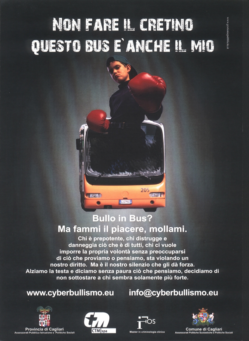 “Non fare il cretino, questo bus è anche il mio” (2010). La campagna è stata lanciata dal gruppo di formazione Ifos per combattere il bullismo sugli autobus a Cagliari. In realtà, il termine più corretto sarebbe stato vandalismo, visto che sotto la campagna è diretta contro “chi distrugge ciò che è di tutti”. Poco comprensibile l’immagine del ragazzino coi guantoni da boxe: incarna il vandalo immaturo che distrugge gli autobus, oppure dovrebbe rappresentare chi reagisce alla violenza dei vandali? In quest’ultimo caso, sarebbe un messaggio sbagliato perché indurrebbe alla violenza. Ma è più probabile che il ragazzino coi guantoni rappresenti il vandalo: in questo caso, allora, sarebbe stato più efficace metterlo maggiormente in ridicolo, evidenziando – appunto – la sua cretinaggine. Efficace, comunque, l’invito ad alzare la testa: il silenzio dà forza ai prepotenti.