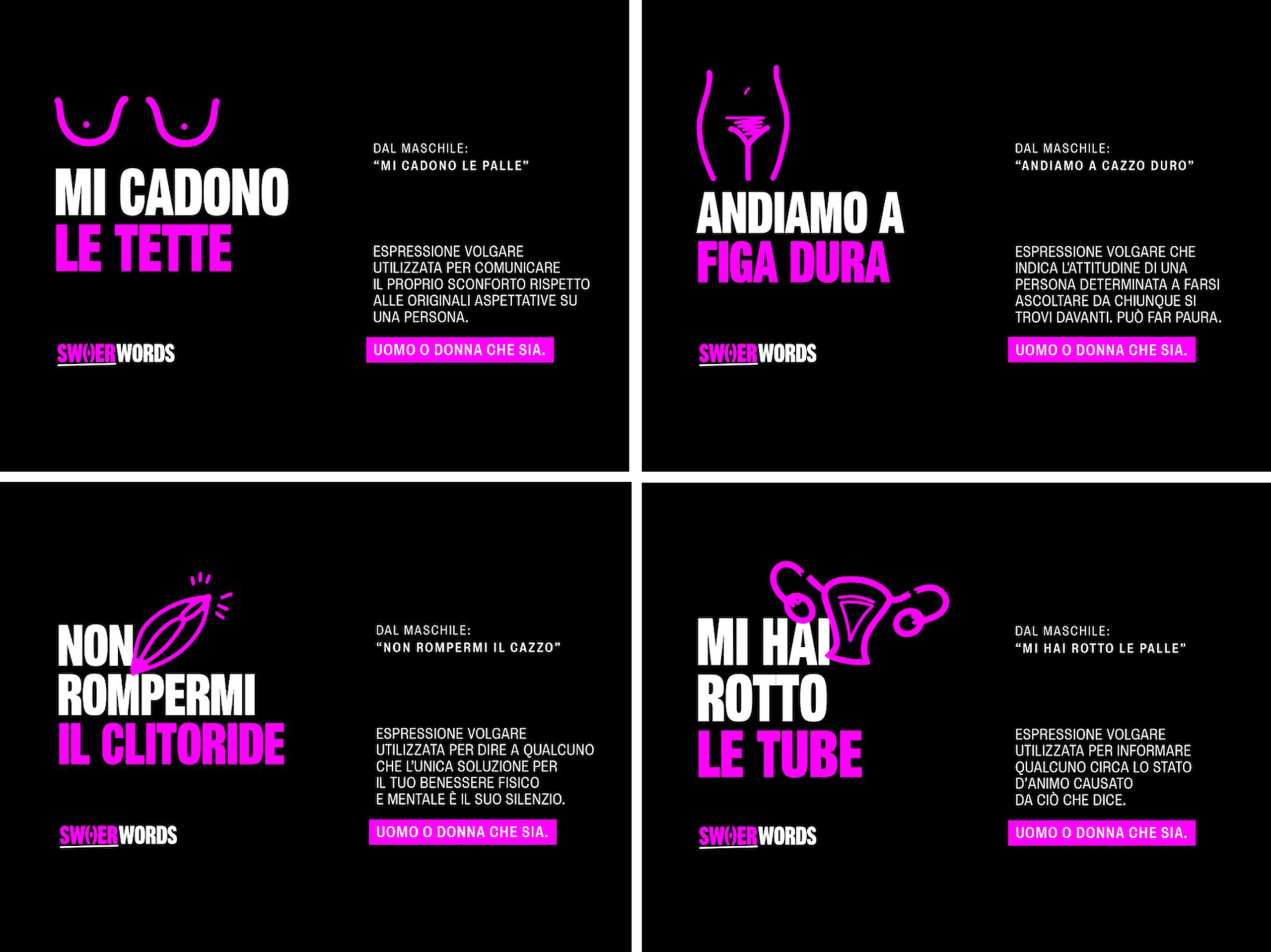 “Mi cadono le tette” – “Andiamo a figa dura” – “Non rompermi il clitoride” – “Mi hai rotto le tube” (2021). Per celebrare l’8 marzo, Giornata della donna, l’agenzia pubblicitaria M&C Saatchi di Milano ha lanciato “Swherwords”, gioco di parole di “swearwords” (parolcce) + “her” (lei). In pratica ha preso 4 espressioni volgari basate su attributi maschili e le ha declinate al femminile. La scelta è patetica o ridicola, a seconda dei punti di vista: i diritti delle donne si giocano su ben altri piani che non quelli linguistici (sul lavoro, la carriera, il part time, i sostegni economici). E, sul piano linguistico, i modi di dire “femminilizzati” tentano di correggere espressioni che hanno decenni se non secoli di storia, che non si cancellano con un maquillage improvvisato. Con esiti involontariamente comici: “andare a figa dura” è un’espressione senza senso perché non ha radici nella realtà. Tra l’altro, i pubblicitari non hanno potuto correggere altri modi di dire basati sugli organi maschili: “cazzone” (“figone” diventerebbe un complimento), “che palle” (“che tube” sarebbe insensato), “testa di cazzo” (testa di figa”….), “incazzarsi” (c’è già “infighettarsi” ma ha il senso di “abbellirsi, vestirsi in modo elegante”). L’unica espressione azzeccata è “mi cadono le tette”, perché dà l’idea della vecchiaia, oltre a rimandare alla memoria “far venire il latte alle ginocchia” (riferito peraltro alla mungitura, quando ooccorreva aspettare molto tempo prima che il latte raggiungesse il livello delle ginocchia).
