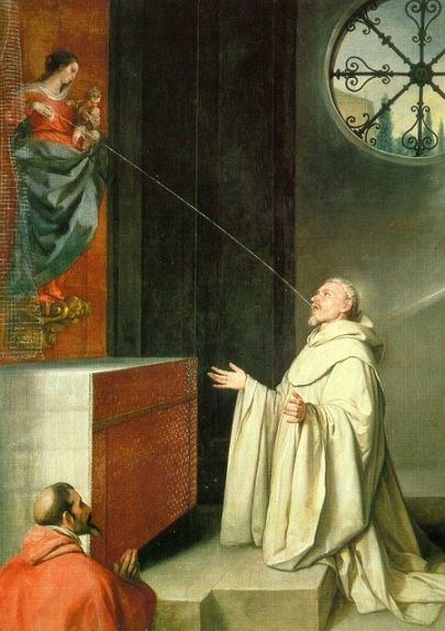 Anzi, si arrivò al punto di rappresentare l’illuminazione mistica di Bernardo di Chiaravalle come una poppata di latte dal seno della Madonna: secondo una leggenda diffusa nel 1300, racconta Victor Stoichita, a Bernardo fu ordinato di predicare davanti al vescovo di Chalon. San Bernardo si rifiutò, si mise in preghiera davanti a Nostra Signora e si addormentò. “Nostra Signora gli mise il suo seno sulla bocca trasmettendogli la scienza divina. Da quel momento Bernardo divenne uno dei predicatori più sottili del suo tempo”. L’episodio fu illustrato da diversi artisti, come Alonso Cano che nel 1656 lo raffigurò come uno schizzo diretto alla bocca del santo (vedi dipinto a destra): d’altronde, era l’unico modo di mantenere le distanze fra la bocca di Bernardo e il seno di Maria. Ma nel frattempo erano cambiati i tempi: con l’austerità dei costumi voluta dalla Controriforma (1563), la Chiesa censurò queste immagini, raffigurando da allora in poi la Madonna in modo più castigato.