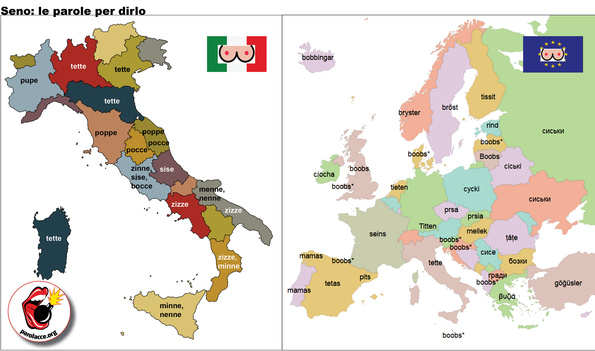 Partiamo dall’analisi linguistica (clicca le mappe per ingrandirle; credito Shutterstock). I termini che si riferiscono al seno fanno riferimento per lo più alla loro forma rotonda (meloni, bisacce, palloni) o sporgente (zinne, dal longobardo “merlo di una muraglia”). Molto diffuso il termine poppe, che – contrariamente a quanto si può immaginare – non deriva dal termine poppare (che ne è un derivato) bensì da pupa, ragazza. Come dire che il seno è un elemento caratterizzante della femminilità. Da questo termine, tra l’altro, deriva anche l’inglese boobs.