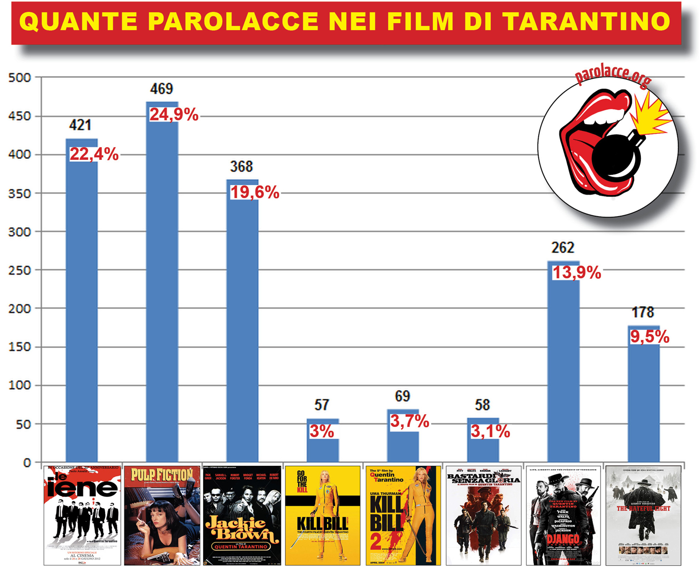 Innanzitutto, definiamo il campo d’analisi: Roeder ha esaminato le 7 pellicole principali dirette da Tarantino: “Le iene” (1992), “Pulp fiction” (1994), “Jackie Brown” (1997), “Kill Bill vol. 1” (2003), “Kill Bill vol. 2” (2004), “Bastardi senza gloria” (2009), “Django unchained” (2012). A questa analisi (i dati grezzi li trovate qui) ho aggiunto le parolacce contenute in “The hateful eight” (2015), di cui lo stesso Roeder ha esaminato la sceneggiatura (che potrebbe avere alcune differenze rispetto al film effettivo).