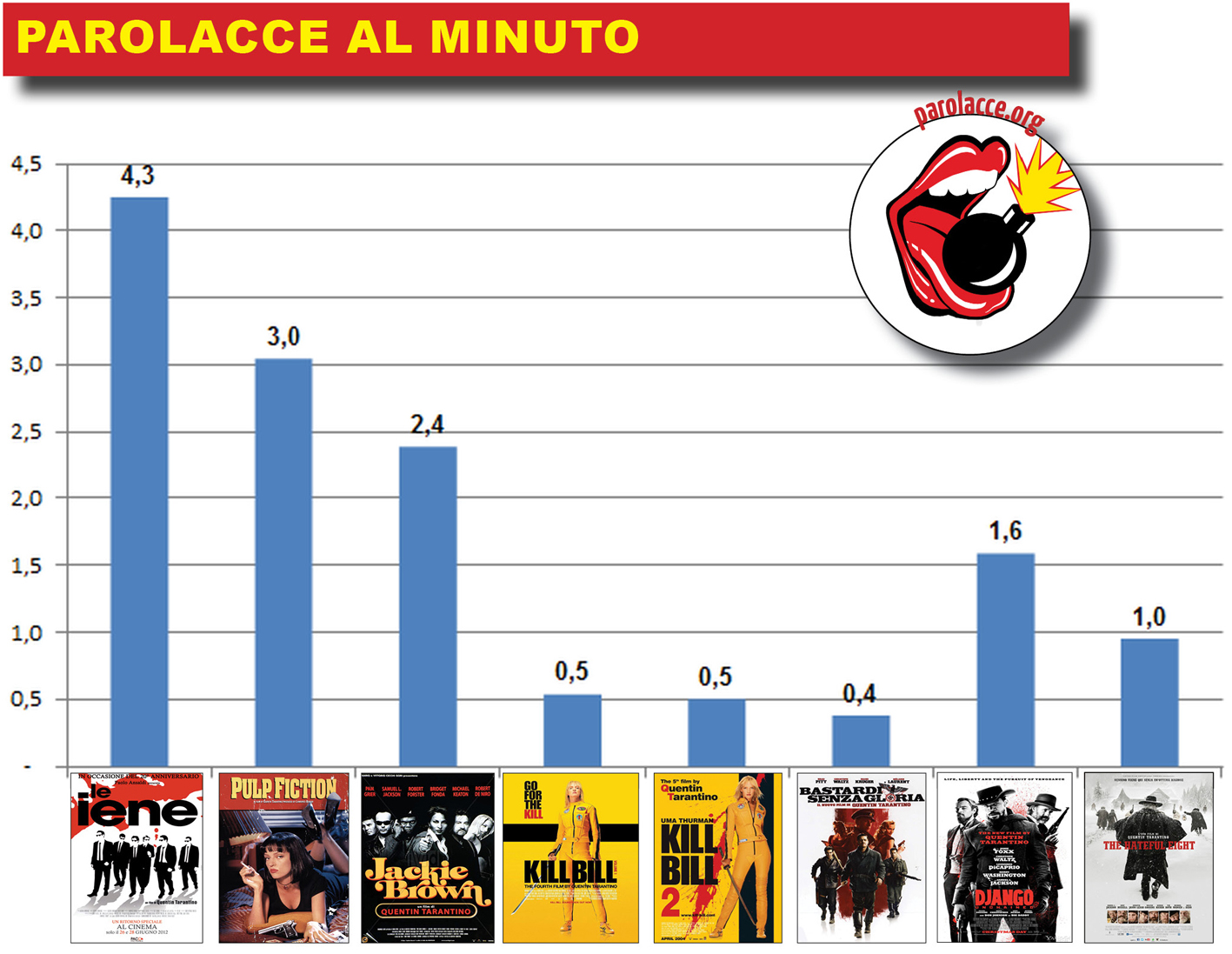 E, allo stesso modo, i film col maggior numero di insulti sessisti verso le donne (bitch, pussy) sono “Jackie Brown”, “Kill Bill” 1 e 2: tutti con protagoniste femminili. Da notare un fatto non scontato: sono quasi assenti gli insulti omofobi, faggot (frocio) è stato censito una sola volta. Almeno finora, quindi, l’omofobia non è dunque una delle ossessioni del regista, che ha preferito approfondire altri sentimenti, dall’odio razziale al senso dell’onore, alla vendetta, e così via.