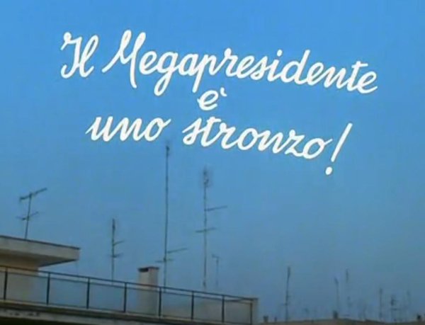 Anche un perdente assoluto come Fantozzi cerca di mantenere la propria dignità. Ecco perché non mancano – e sono diventate memorabili – le scene in cui l’eroe tragicomico reagisce alle sopraffazioni insultando i potenti. Un giorno (“Fantozzi contro tutti”) esprime un desiderio: “Il megapresidente è uno stronzo, è. Certe volte mi vien voglia di scriverlo in cielo”. Per una beffa del destino, il desiderio si avvera, e la scritta campeggia nell’azzurro. In ditta suonano tutti gli allarmi, e dopo un’accurata perizia calligrafica, Fantozzi viene identificato e redarguito. Graffiante la scena in cui Fantozzi tenta di giustificarsi col “megapresidente arcangelo” in persona: “Ma io non l’ho scritto, l’ho solo pensato!” dice. “E’ questo il suo errore” gli risponde il megapresidente. “Lei non deve pensare”: più satira di così.