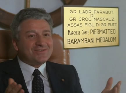 Insomma, Villaggio metteva a nudo (per ridicolizzarli) gli abusi di potere. Tanto che, già nella litania di titoli più o meno nobiliari di cui spesso si fregiano i capi, inseriva espliciti indizi della loro personalità: sulla targa della porta di Barambani, infatti, spicca la sequenza di titoli tutt’altro che accademici: “Gr. ladr. farabut. Gr. Croc. mascalz. assass. figl. di gr. putt. marchese conte…”.