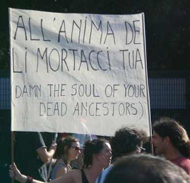 LI MORTACCI TUA(romanesco) = i tuoi spregevoli defunti: la frase potrebbe essere una contrazione di “siano maledetti i tuoi spregevoli defunti”. Ha un equivalente in napoletano: “All’anm e chi t’è muort”, all’anima di chi ti è morto (abbreviato anche in “Chi te mmuort”) e in in arabo (Yin’al mayteen ehlak, siano maledetti i tuoi antenati).
