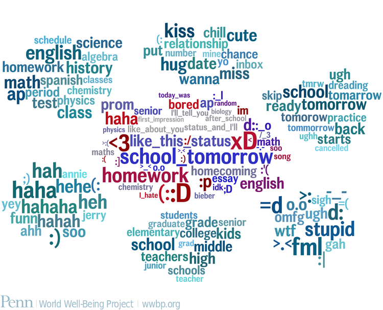 In generale gli adolescenti fanno molto uso di emoticon e abbreviazioni (xD, :D). I temi relativi alla scuola sono ovviamente diffusi, e fanno capolino gli argomenti sulle esperienze sentimentali (bacio, relazione, appuntamento). |