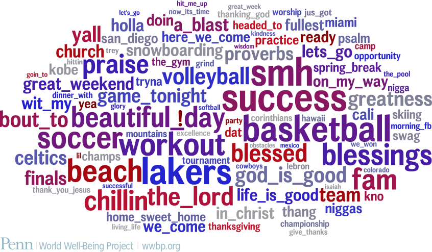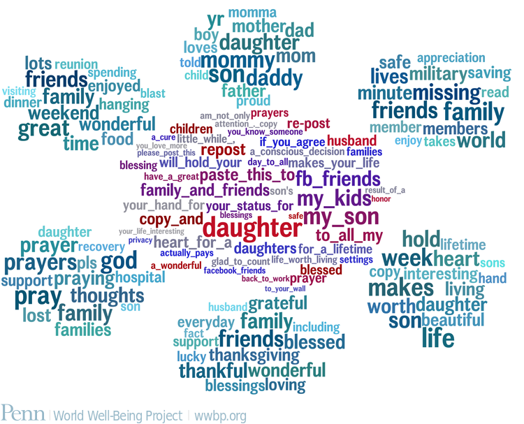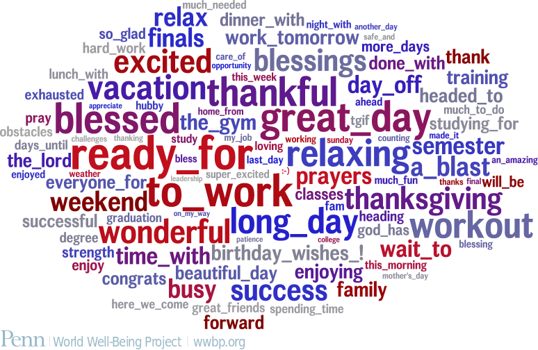 | Le parole riflettono un senso religioso (preghiera, chiesa, Dio ti benedica), benessere (eccitato, meraviglioso, sorprendente) e relazioni sociali positive (vi amo tutti, grazie, amici). |