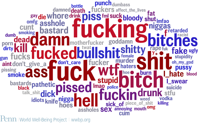 Le persone equilibrate usano pochissime parolacce: ne risultano solo 2. Al 55° e al 95° posto figurano infatti due sinonimi di “negro” (niggas e nigga). Questo termine gergale, però, se usato da persone di colore ha un termine affettuoso (“fratello”): e forse è questo il senso prevalente.