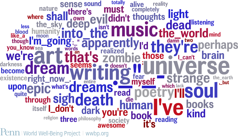 | Le parole riflettono una sensibilità artistica (anima, musica, sogni, universo) e un maggior uso di pronomi personali (noi siamo, voi siete, io ho…). |