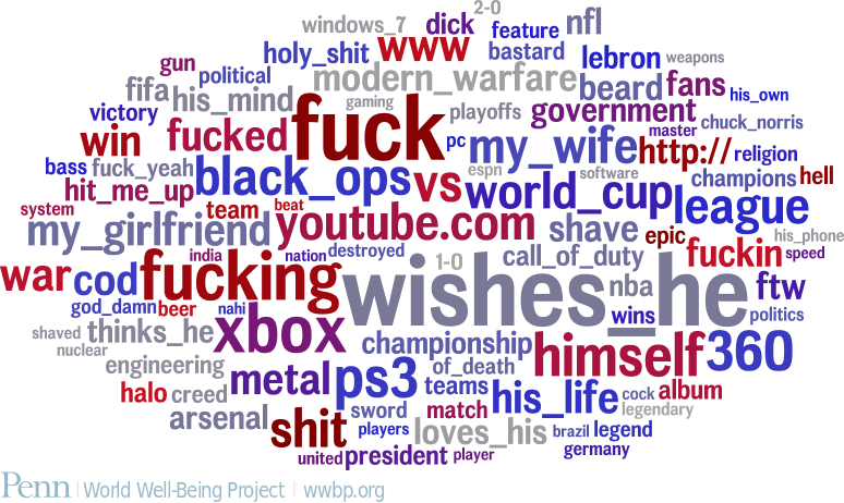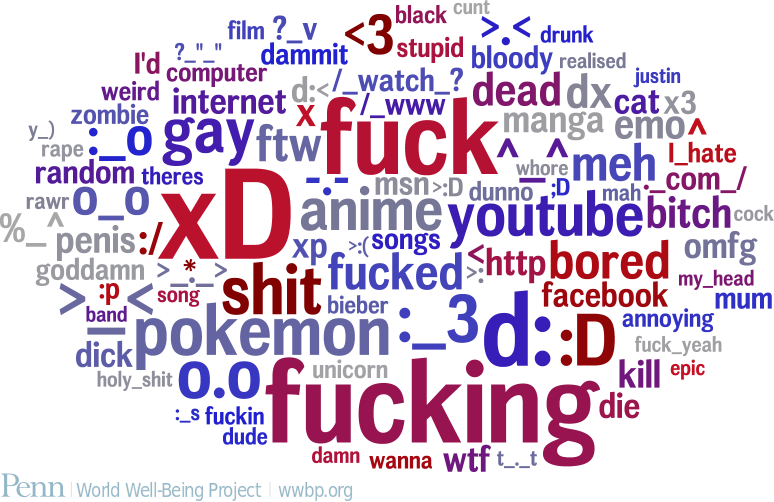 Lo scoprirete cliccando qui sotto: troverete le “word cloud”, nuvole verbali, che mostrano le parole più usate (la fonte completa dei dati è qui). I risultati sono intriganti: scoprirete non solo chi è più volgare, ma anche quali sono le parole (e i pensieri) più ricorrenti di uomini & donne, giovani & adulti, nevrotici & equilibrati….