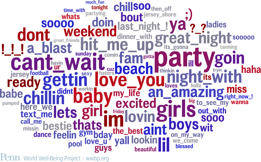 | Nell’elenco delle 100 parole più usate non figurano parolacce. Le parole più usate riflettono successo e impegno a scuola o al lavoro (successo, finali, lavoro), e attività che favoriscono il relax (weekend, famiglia, vacanza) e godimento (divertimento, meraviglioso). |