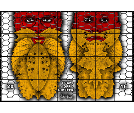E una delle ultime opere (2016) nella serie “THE BEARD PICTURES” (le immagini della barba, 173 pezzi) si intitola “FUCK OFF HIPSTERS” (fanculo hipster). (vedi foto 6 sotto)