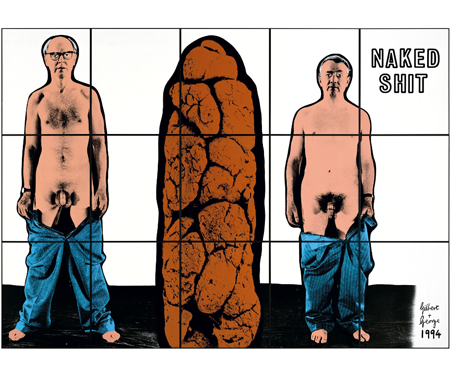 Nel 1994 hanno creato 20 opere intitolate “THE NAKED SHIT PICTURES” (i disegni della merda nuda) in cui Gilbert & George appaiono nudi in varie pose, affiancati da immagini di escrementi: una umanità ridotta all’essenziale, alla mera biologia delle sue parti. “c’è qualcosa di religioso nel fatto che siamo fatti di escrementi”, hanno detto. (vedi foto 3 sotto)