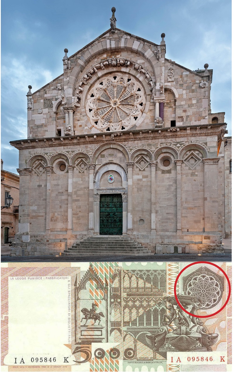La cattedrale con il rosone, riprodotto (sotto) sulle banconote da 5mila lire (foto Shutterstock).