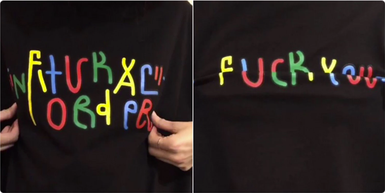 Nel 2016 il marchio Alyx (fondato dallo stilista americano Matthew Williams) lancia una T-shirt con una scritta incomprensibile. Che diventa intellegibile quando si piega in due la maglietta, rivelando la scritta “Fuck you” (vaffanculo). Un virtuosismo sartoriale all’insegna della goliardia.