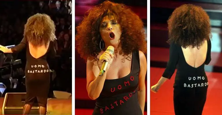 E’ l’anno 2005 e la cantante Marcella Bella porta al festival di Sanremo un brano intitolato “Uomo bastardo”: la canzone racconta la storia di un amore masochistico per un uomo che una donna divide con un’altra donna. La cantante si presenta sul palco con un abito sul quale è ricamato il titolo del brano, sia di fronte che dietro.