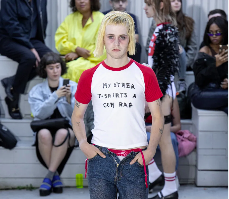 La maglietta ha fatto scalpore alla settimana della moda di Londra pochi giorni fa (2019). Era una T-shirt da baseball bianca e rossa, e recava la scritta, vergata con un pennarello: “My Other T-Shirts A Cum Rag”, ovvero: “Le mie altre magliette sono stracci per la sborra”. A completare il quadro, era indossata da un modello con le occhiaie enfatizzate dal trucco. L’ha realizzata un giovane stilista, Gareth Wrighton, ed è diventata virale sul Web: che poi abbia successo anche nei negozi (ammesso che sarà messa in commercio) è tutto da vedere.