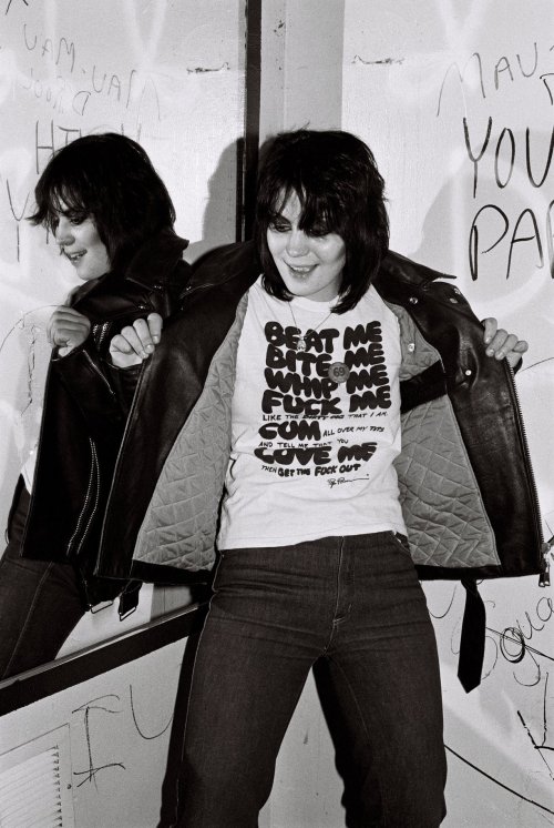 La scritta è lunghissima, quasi un romanzo: “Beat Me, Bite Me, Whip Me, Fuck Me Like The Dirty Pig That I Am, Cum All Over My Tits And Tell Me That You Love Me.Then Get The Fuck Out”. Significa: “Picchiami, mordimi, frusta, fottimi come lo sporco maiale che sono, sborrami sulle tette e dimmi che mi ami. Quindi vattene fuori dal cazzo”. La maglietta risale al 1977 ed è una creazione di Malcolm McLaren e della britannica Vivienne Westwood, la stilista del movimento punk sempre sopra le righe e provocatrice. In questa foto la T-shirt è indossata dalla cantante Joan Jett.