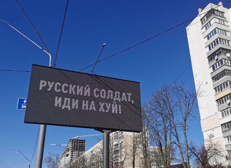 In una delle strade principali di Kiev un cartello dice: “Soldati russi, andate affanculo” (nella foto).