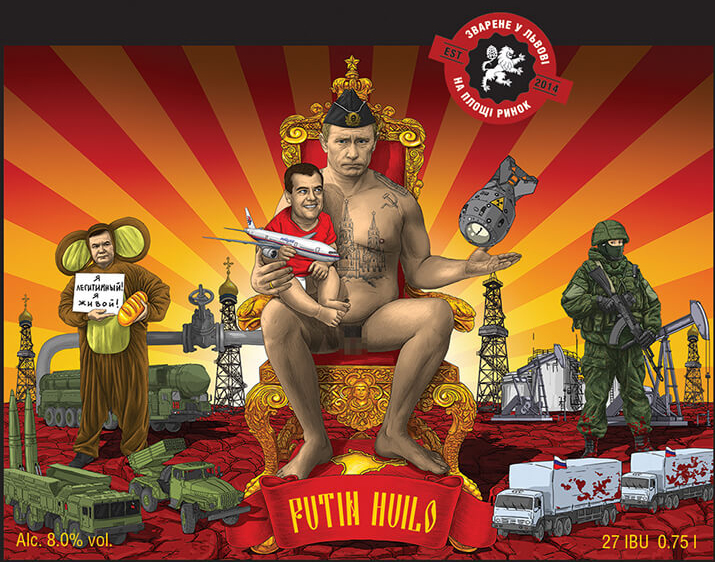 La fabbrica di birra Pravda, con sede a Lviv, in Ucraina, ha sospeso le sue operazioni di produzione della birra: ora sta preparando bottiglie molotov per i residenti da usare contro le forze russe. E a questo scopo utilizzano una particolare birra prodotta dal 2016, la “Putin huilo”, che significa “Putin testa di cazzo”: l’etichetta raffigura il presidente Putin nudo, che tiene sulle ginocchia Dmitrij Medvedev (all’epoca primo ministro), con riferimenti ai rapporti tra Russia e Ucraina, alla Crisi della Crimea del 2014 e lo sfruttamento petrolifero.
