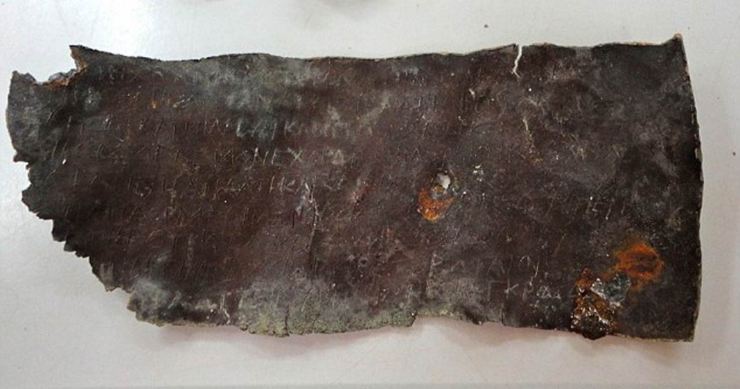 Tavoletta di piombo con incise le maledizioni. I fori sono stati lasciati dai chiodi (4° sec. a.C.)