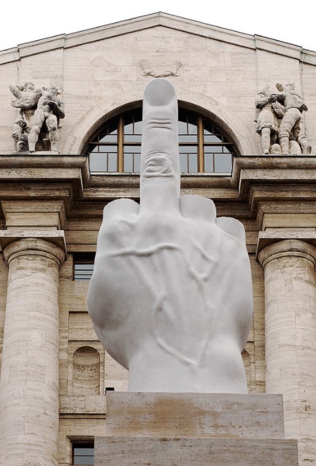 La scultura L.O.V.E. di Maurizio Cattelan di fronte alla Borsa di Milano.