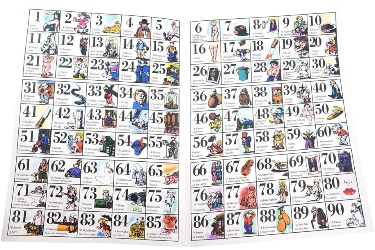 il numero sortito, nella Tombola, il maestro di gioco pronunci, in luogo del semplice nome, una frase, un detto, quali: 4. “O Puorco: chi ‘o tira, fetente chi ‘o mette” (Maiale chi lo prende, fetente chi lo dà) 16. “Tutte quante ‘o tèneno: ‘o culo” (L’hanno tutti quanti: il culo) 63. “A tene càvera e pelosa: ‘a sposa” (L’ha calda e pelosa: la sposa).