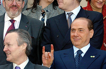 Il celebre gesto delle corna di Berlusconi durante la foto ufficiale dei leader europei nel 2002